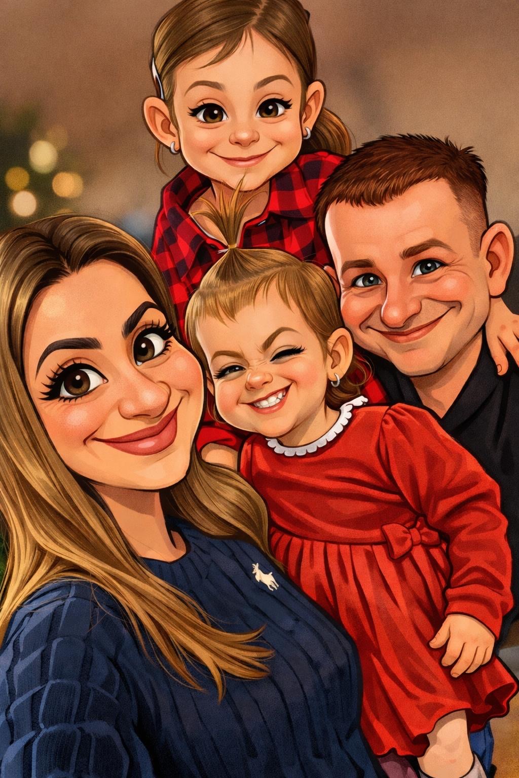 Kolorowa kreskówkowa karykatura portret rodzinny ze zdjęcia to personalizowany obraz tworzony na podstawie fotografii przesłanej przez zamawiającego. Oferujemy druk wysokiej jakości w wybranym rozmiarze, z możliwością zamówienia z ramką lub bez. Idealny pomysł na prezent lub oryginalną dekorację wnętrza.